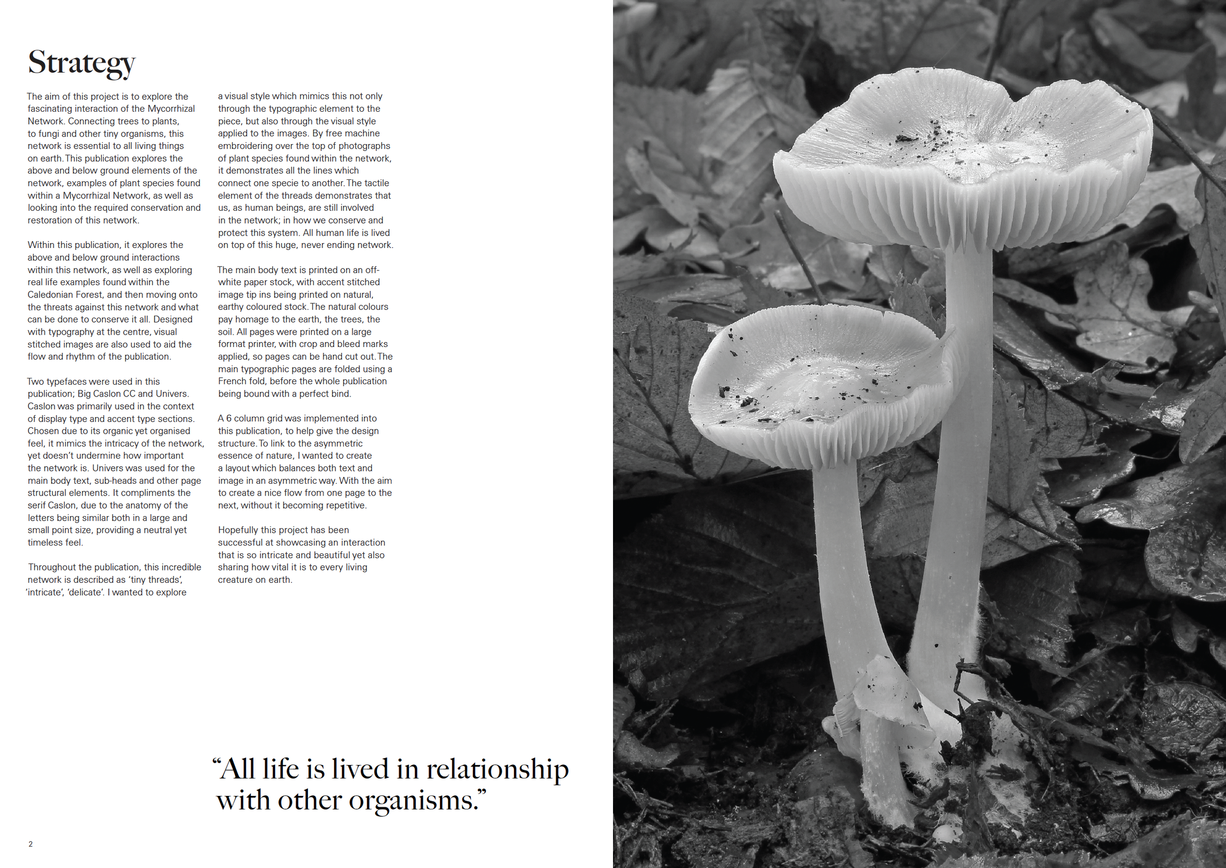 This publication aims to explore the fascinating interaction of the Myccorhizal Network. Connecting trees to plants, to fungi and other tiny organisms. Designed with typography at the heart, machine embroidered images are seen throughout to aid the flow and rhythm of the publication.